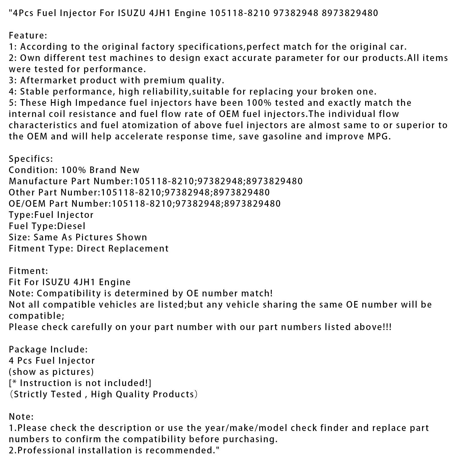 4Pcs Fuel Injector For ISUZU 4JH1 Engine 105118-8210 97382948 8973829480