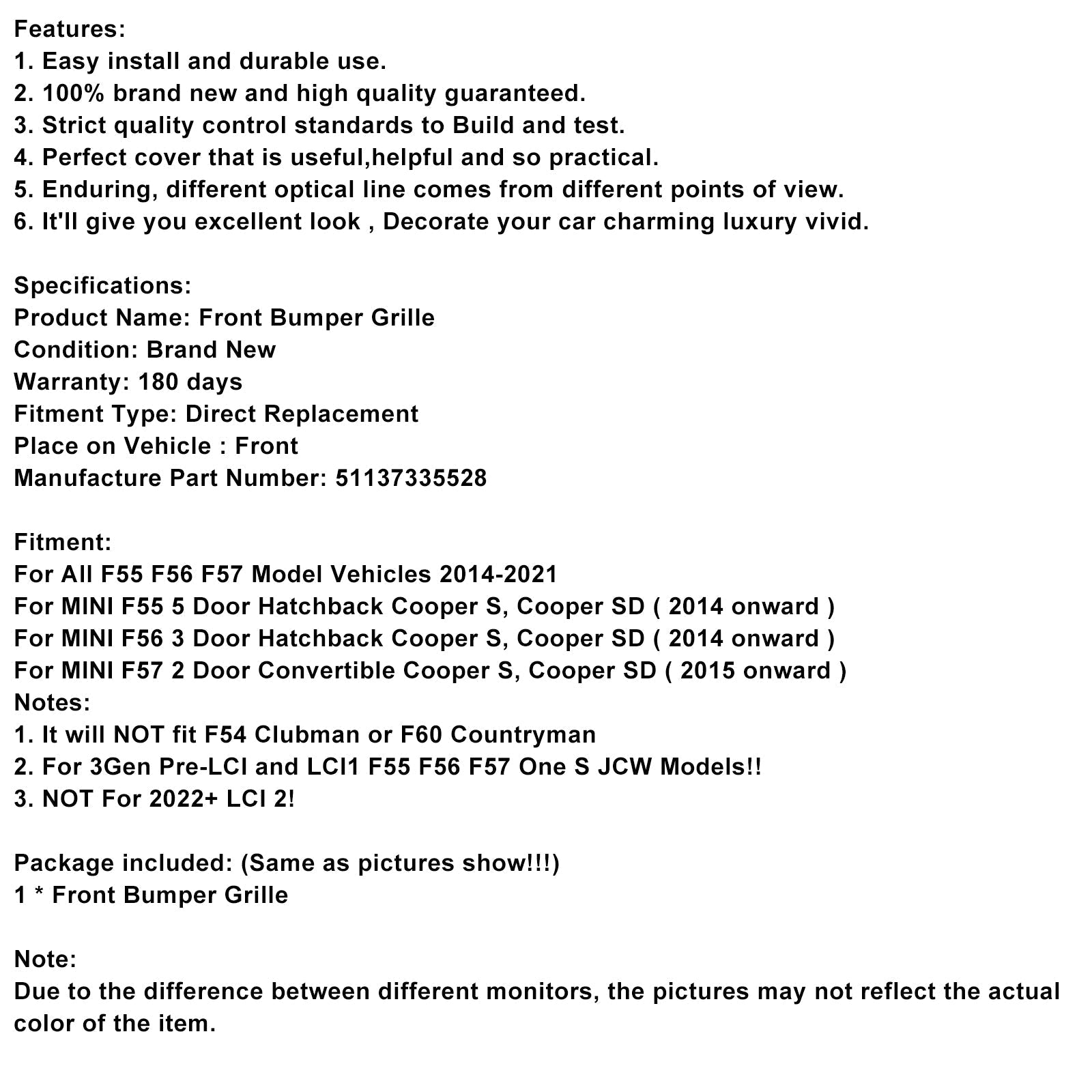 Black Front Mesh Grille Grill 51137335528 Fit Mini Cooper F55 F56 F57 2014-2021