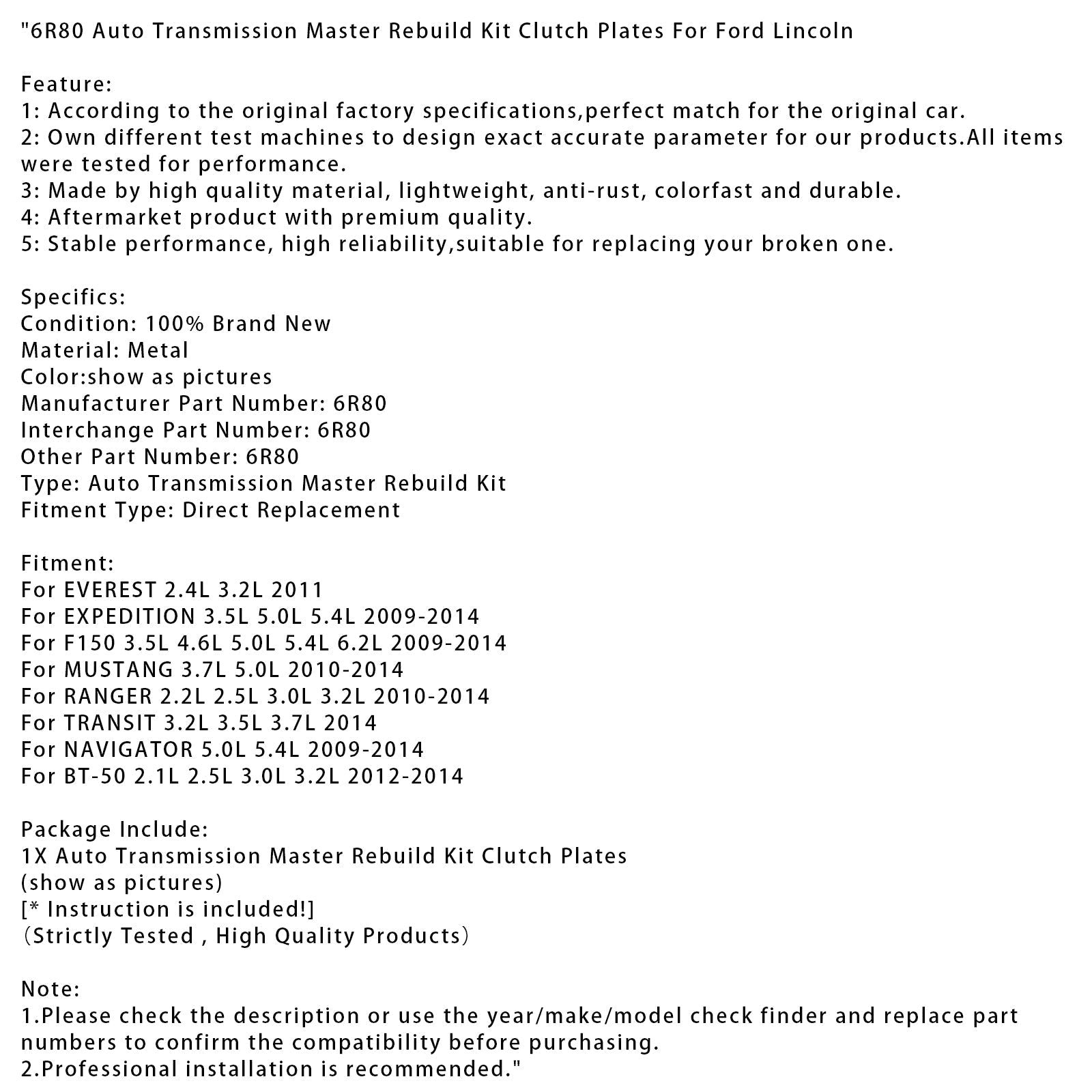 6R80 Auto Transmission Master Rebuild Kit Clutch Plates For Ford Lincoln