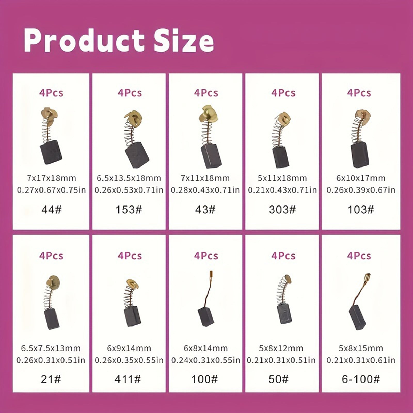 40 Carbon brushes in 10 different sizes,each size 4Pcs(7x17x18 mm, 5x11x18 mm, 6.5x7.5x13 mm,