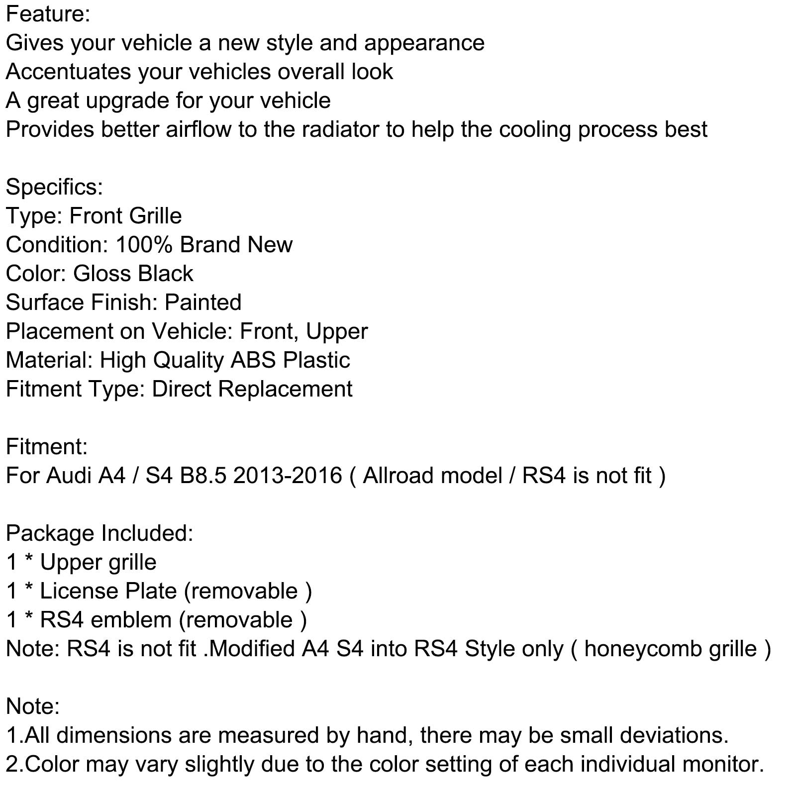 Note: RS4 is not fit .Modified A4 S4 into RS4 Style only ( honeycomb grille )