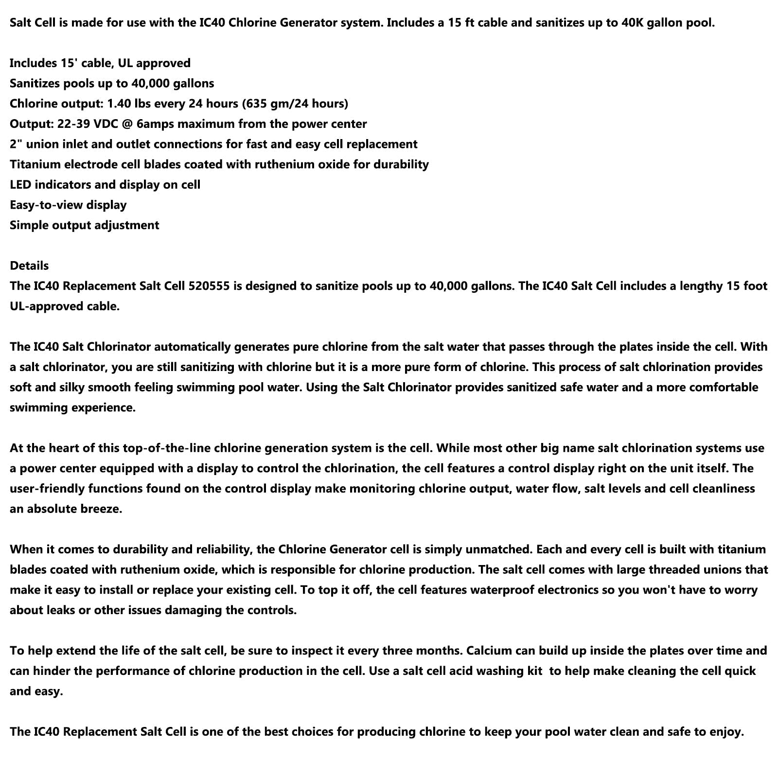 Salt Cell is made for use with the IC40 Chlorine Generator system. Includes a 15 ft cable and sanitizes up to 40K gallon pool.
