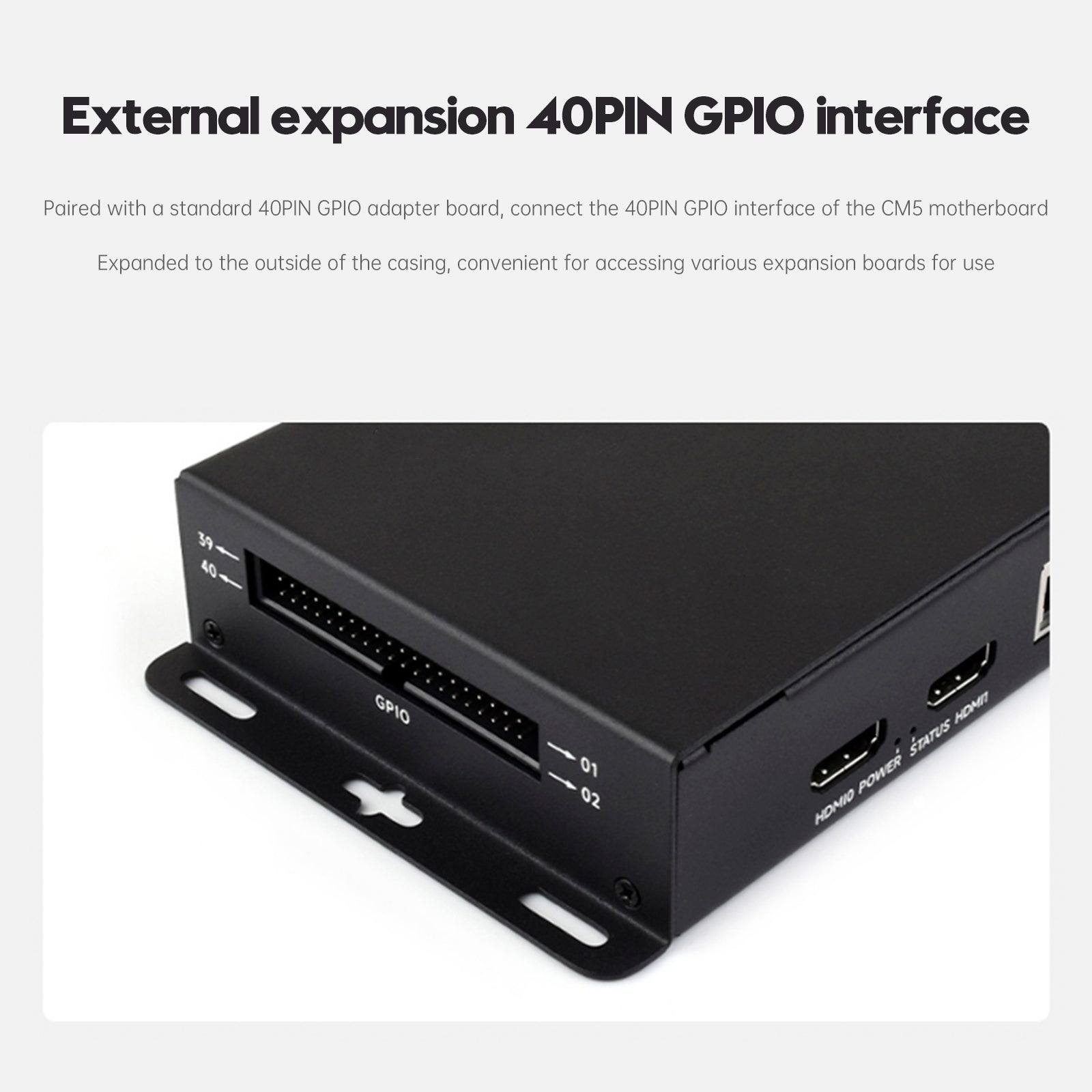 External expansion 40PIN GPIO interface, with a standard 40PIN GPIO adapter board, the 40PIN GPIO interface of the CM5 baseboard is expanded to the outside of the shell, which is convenient for access to various expansion boards