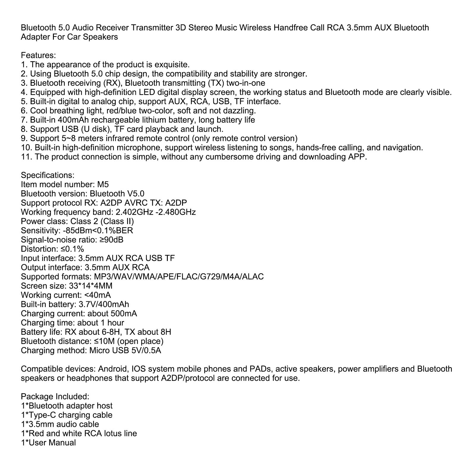 Compatible devices: Android, IOS system mobile phones and PADs, active speakers, power amplifiers and Bluetooth speakers or headphones that support A2DP/protocol are connected for use.