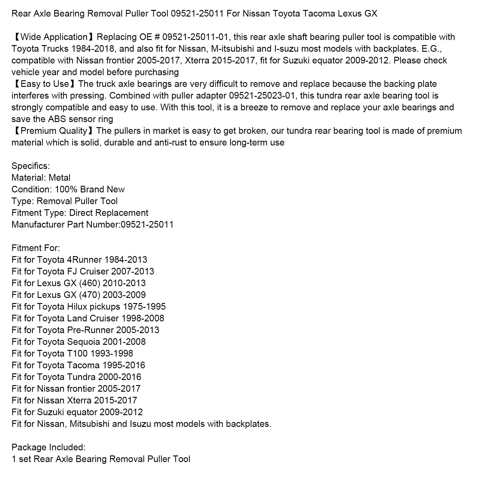 【Easy to Use】The truck axle bearings are very difficult to remove and replace because the backing plate interferes with pressing. Combined with puller adapter 09521-25023-01, this tundra rear axle bearing tool is strongly compatible and easy to use. With this tool, it is a breeze to remove and replace your axle bearings and save the ABS sensor ring