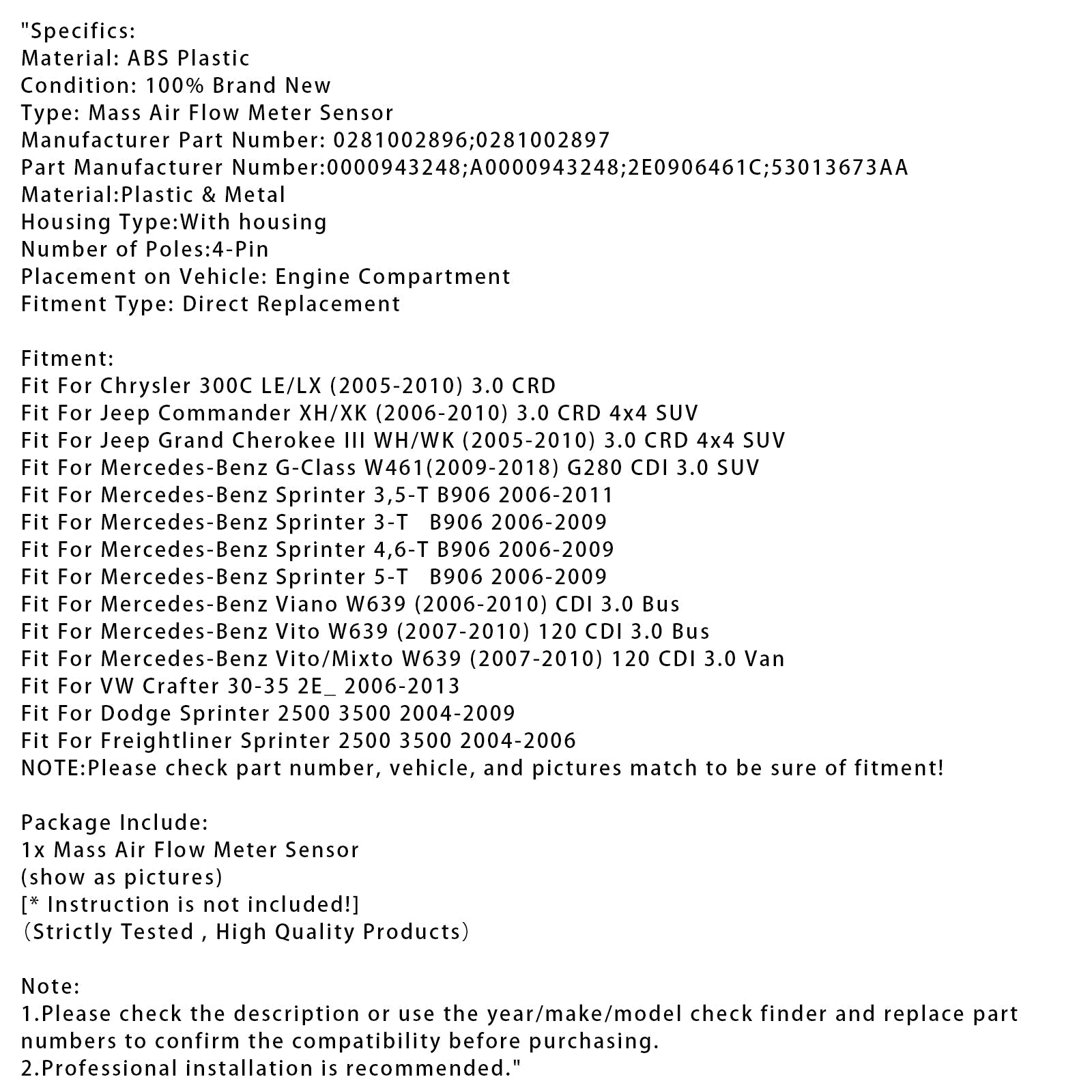Mass Air Flow Meter Sensor For Mercedes-Benz Sprinter Jeep Crafter 0281002896