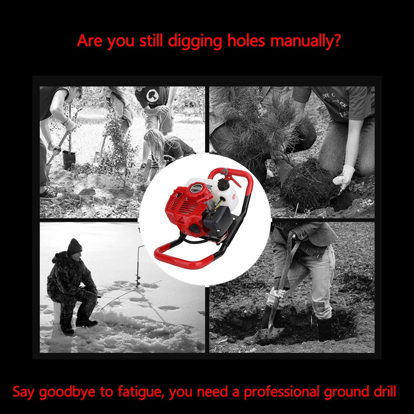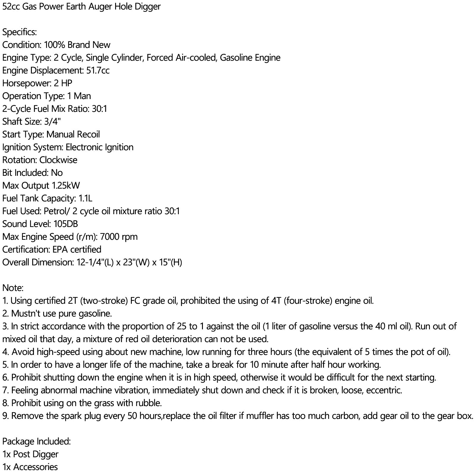 2:Equipped with a 52cc gasoline engine, the auger can be handled by one or two people easily for a wide variety of tasks.
