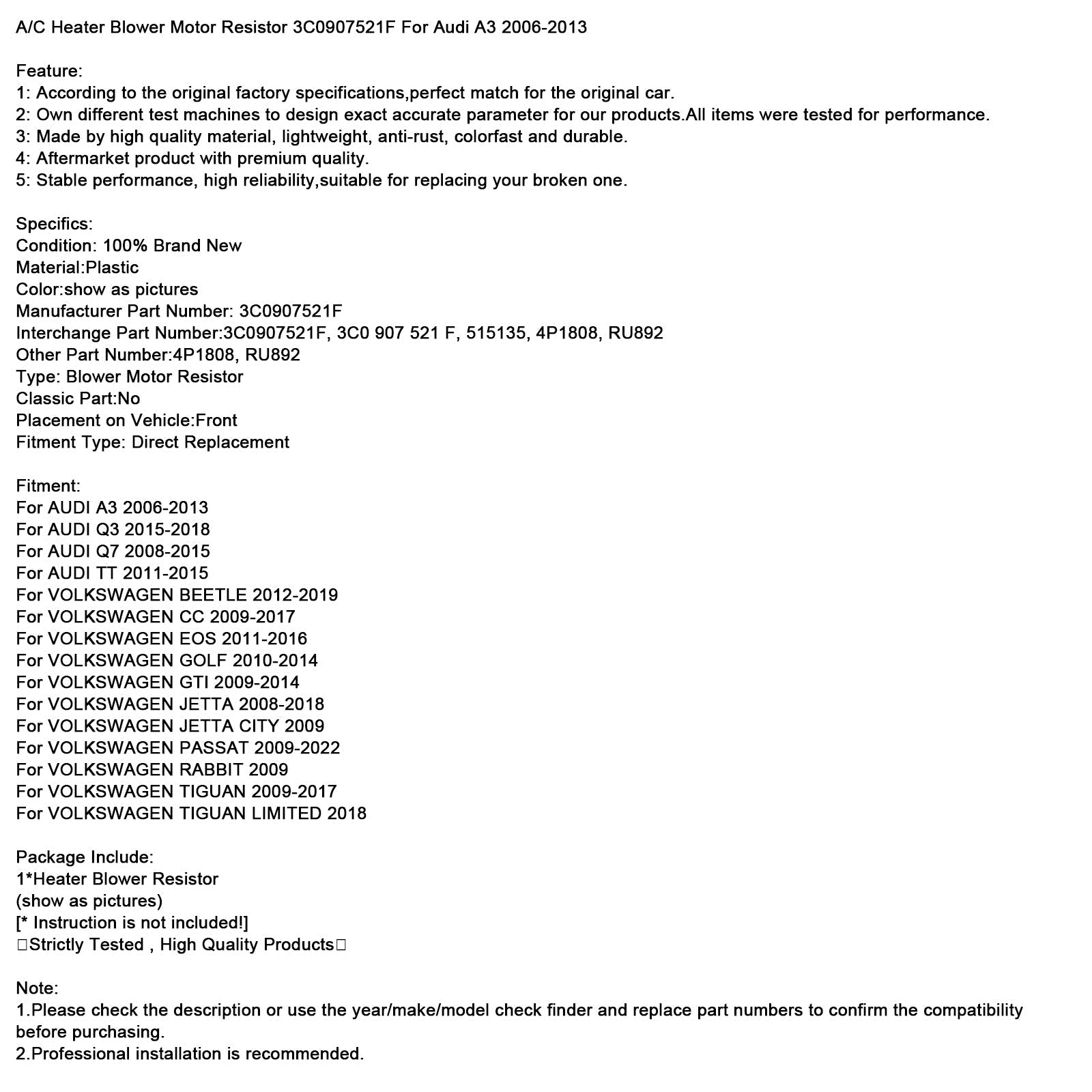 A/C Heater Blower Motor Resistor 3C0907521F For Audi A3 2006-2013