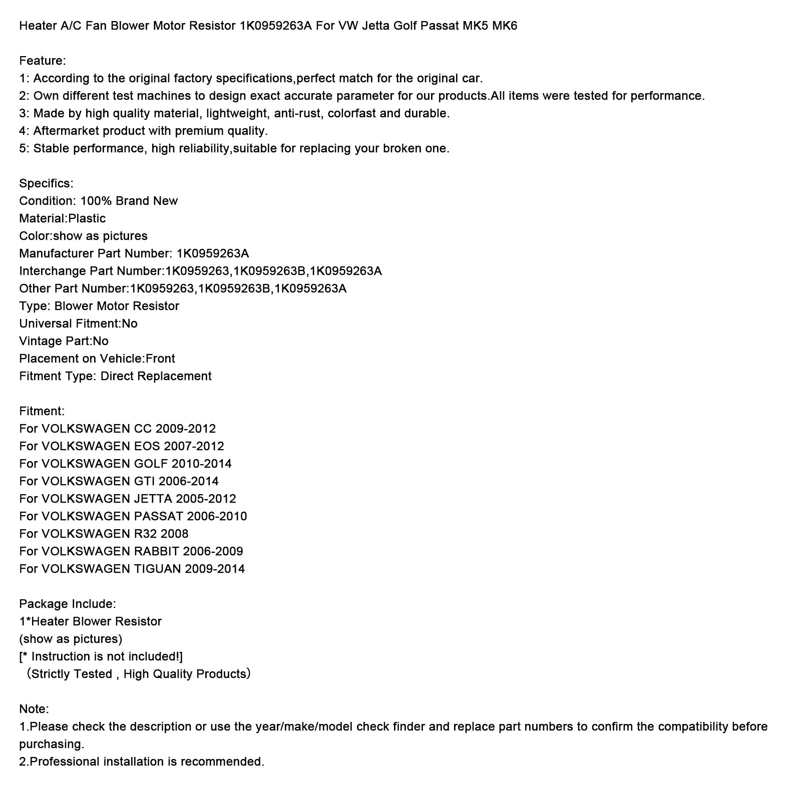 Heater A/C Fan Blower Motor Resistor 1K0959263A For VW Jetta Golf Passat MK5 MK6