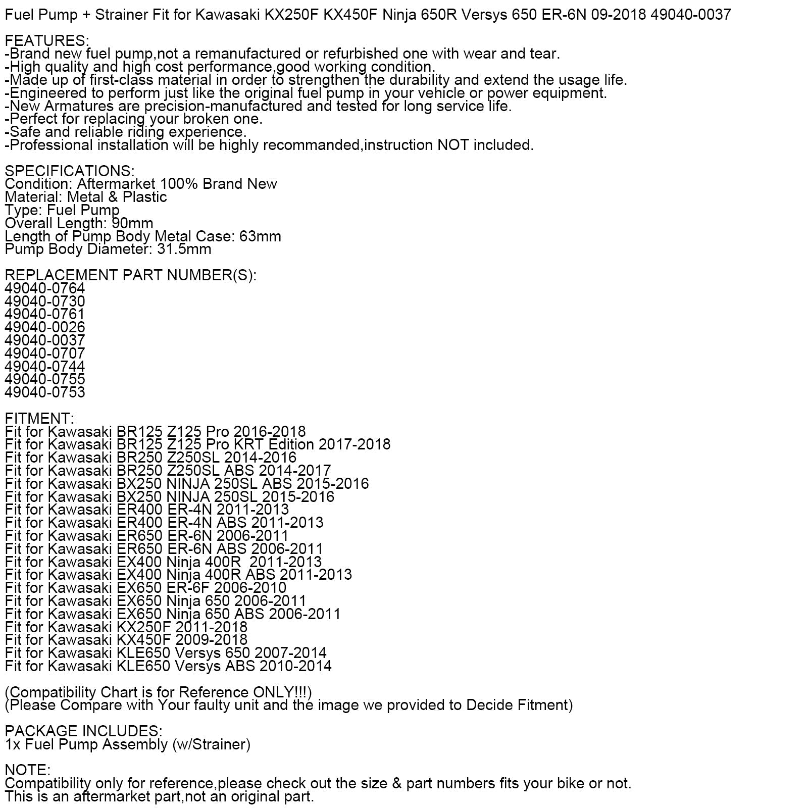 Fuel Pump + Strainer for Kawasaki KX 250 450 F Versys EX 650 R Ninja 06-18 Generic