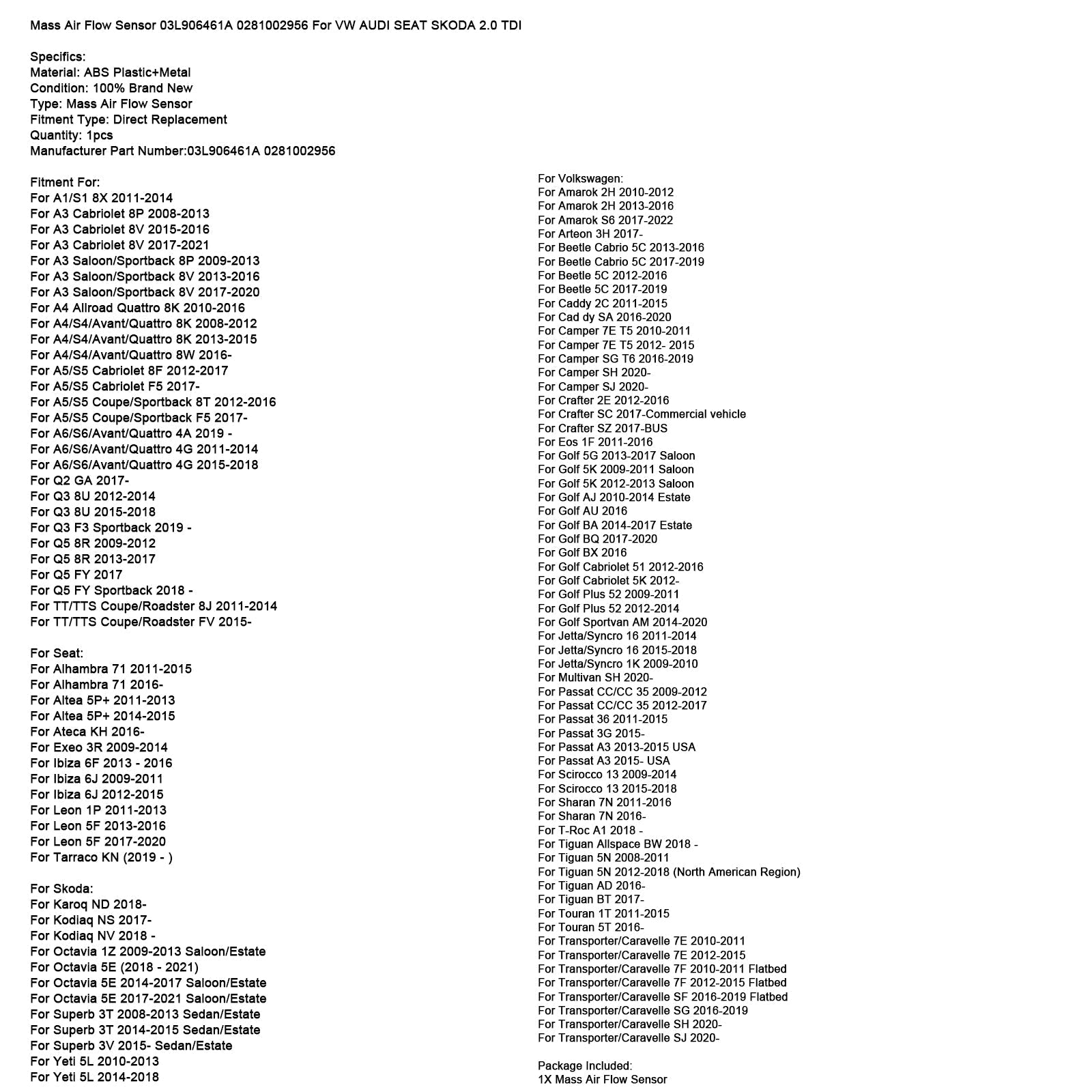 Mass Air Flow Sensor 03L906461A 0281002956 For VW AUDI SEAT SKODA 2.0 TDI