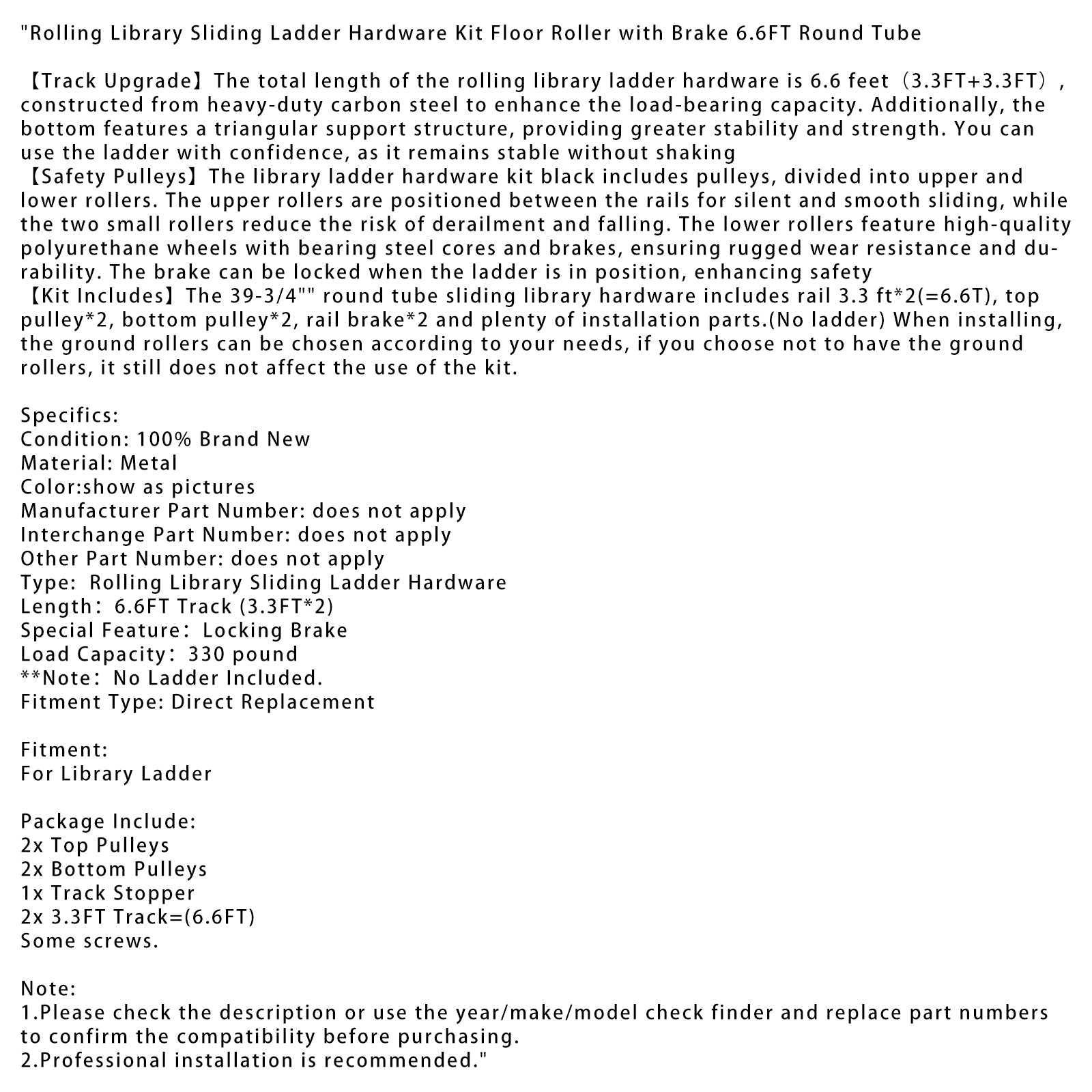 【Kit Includes】The 39-3/4" round tube sliding library hardware includes rail 3.3 ft*2(=6.6T), top pulley*2, bottom pulley*2, rail brake*2 and plenty of installation parts.(No ladder) When installing, the ground rollers can be chosen according to your needs, if you choose not to have the ground rollers, it still does not affect the use of the kit.