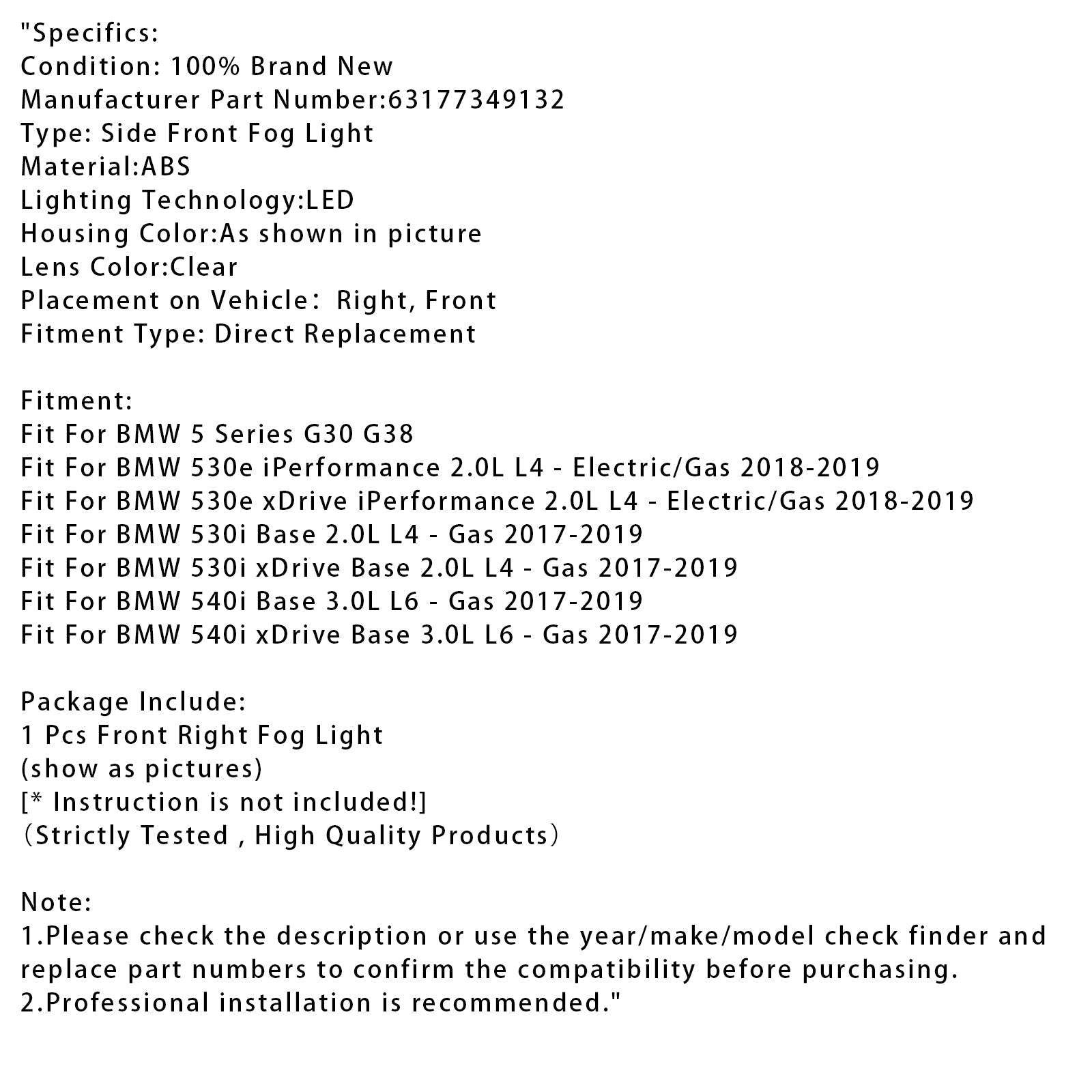 1 Pcs LED Front Right Fog Light For BMW 5 Series G30 G38 17-19 63177349132