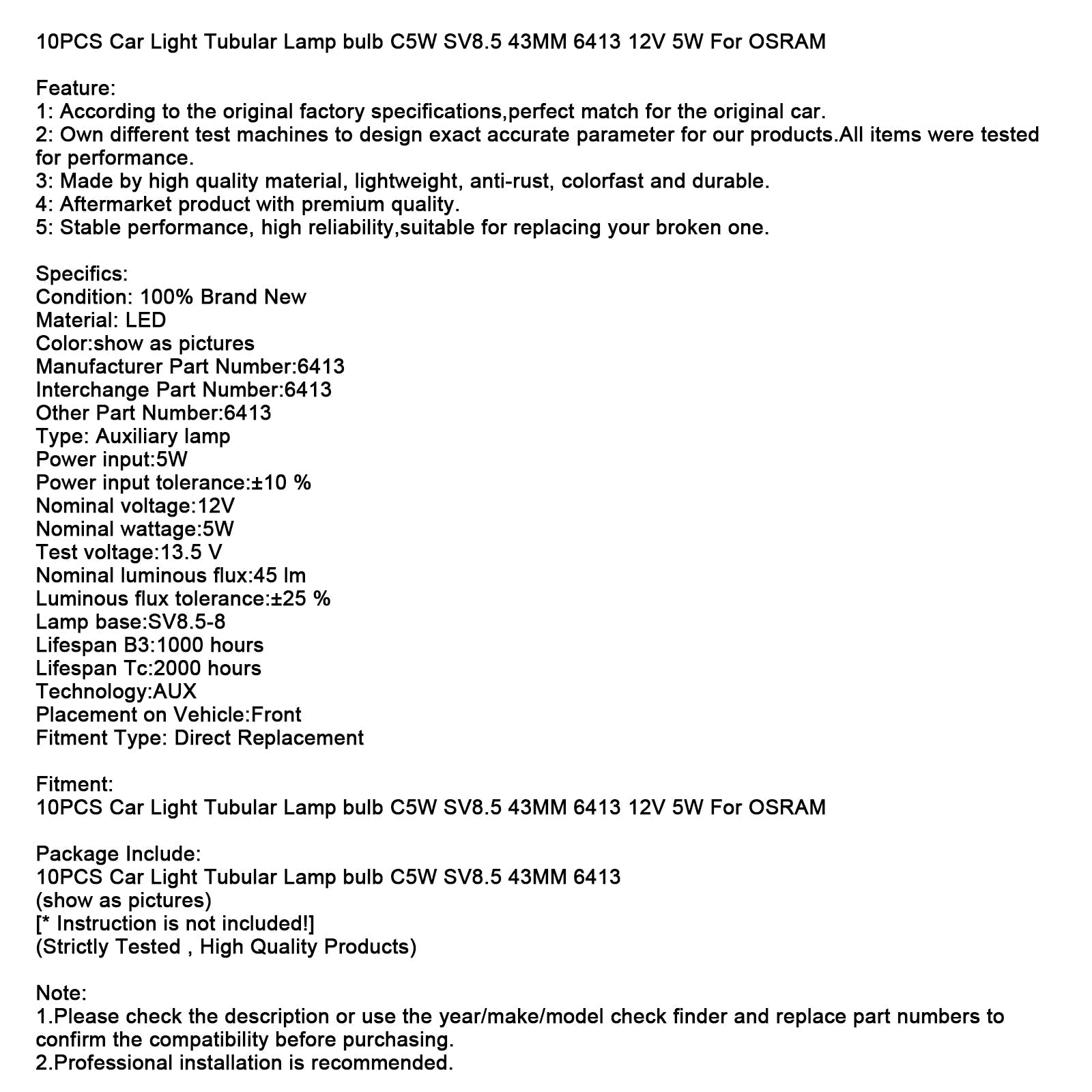 10PCS Car Light Tubular Lamp bulb C5W SV8.5 43MM 6413 12V 5W For OSRAM