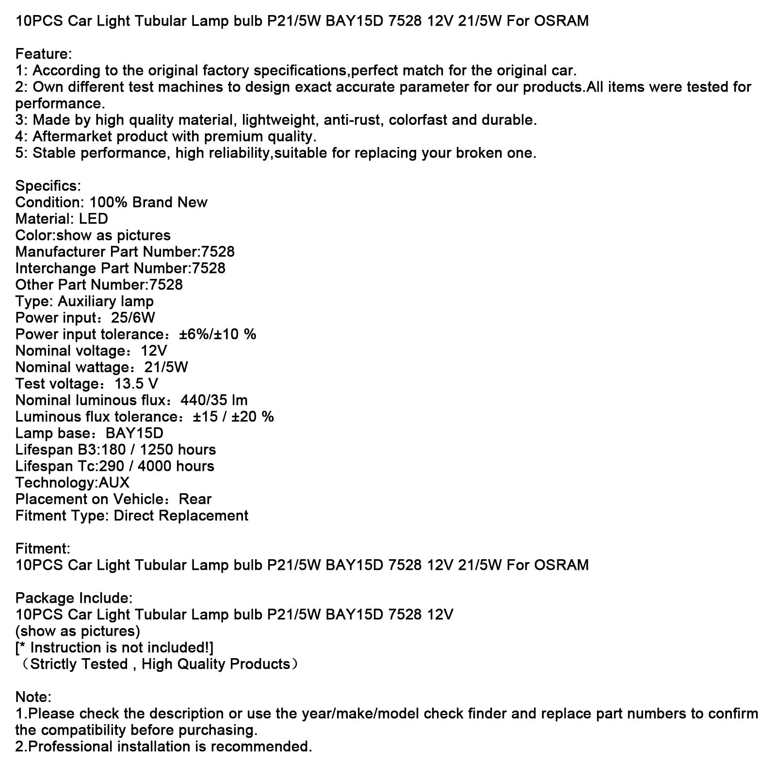 10PCS Car Light Tubular Lamp bulb P21/5W BAY15D 7528 12V 21/5W For OSRAM