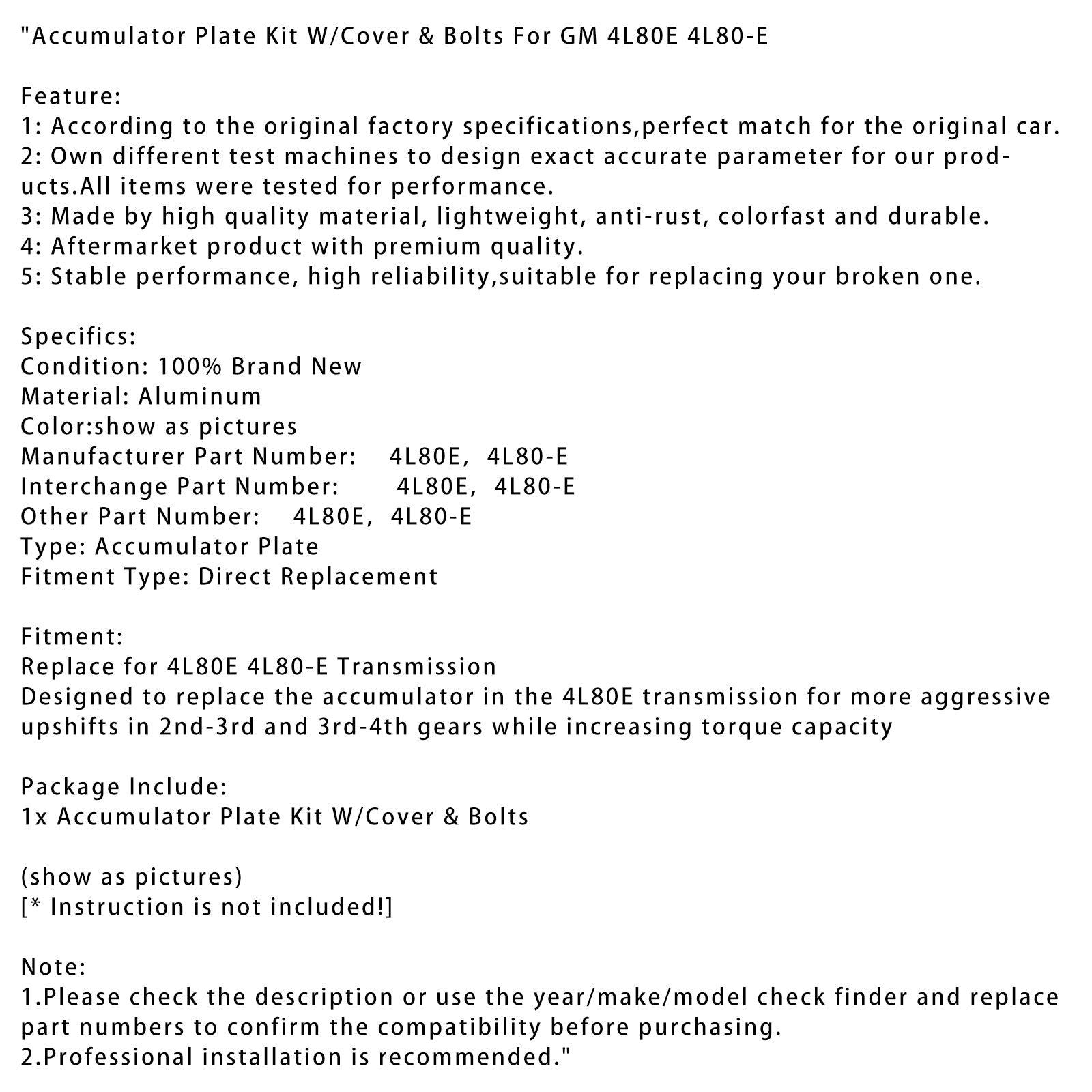 Accumulator Plate Kit W/Cover & Bolts For GM 4L80E 4L80-E