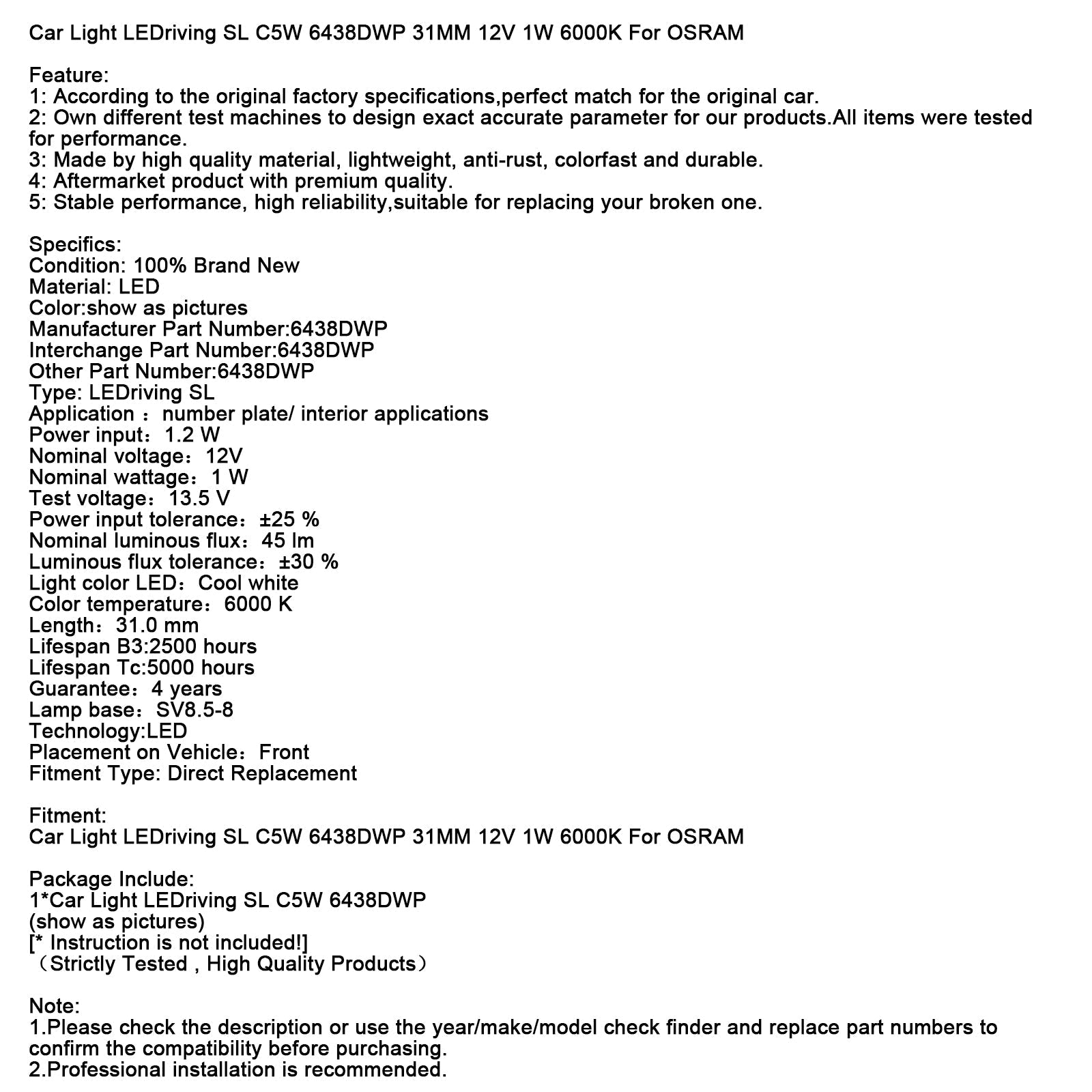 Car Light LEDriving SL C5W 6438DWP 31MM 12V 1W 6000K For OSRAM