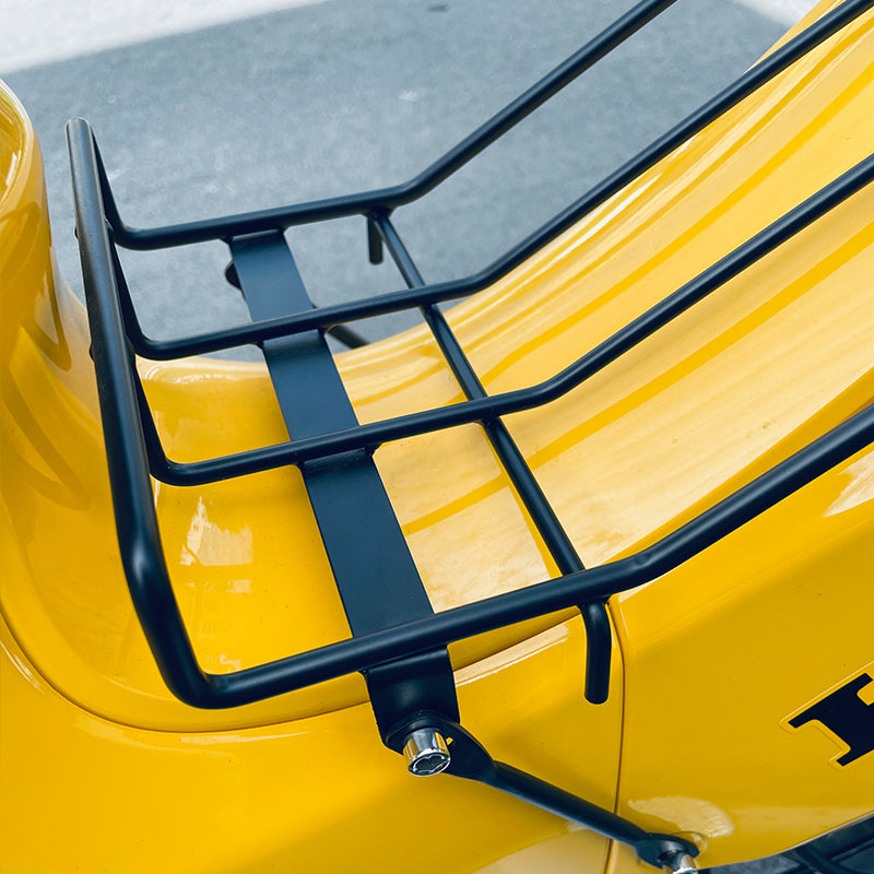 Portaequipajes central especialmente diseñado para fijar al protector de piernas de la bicicleta.