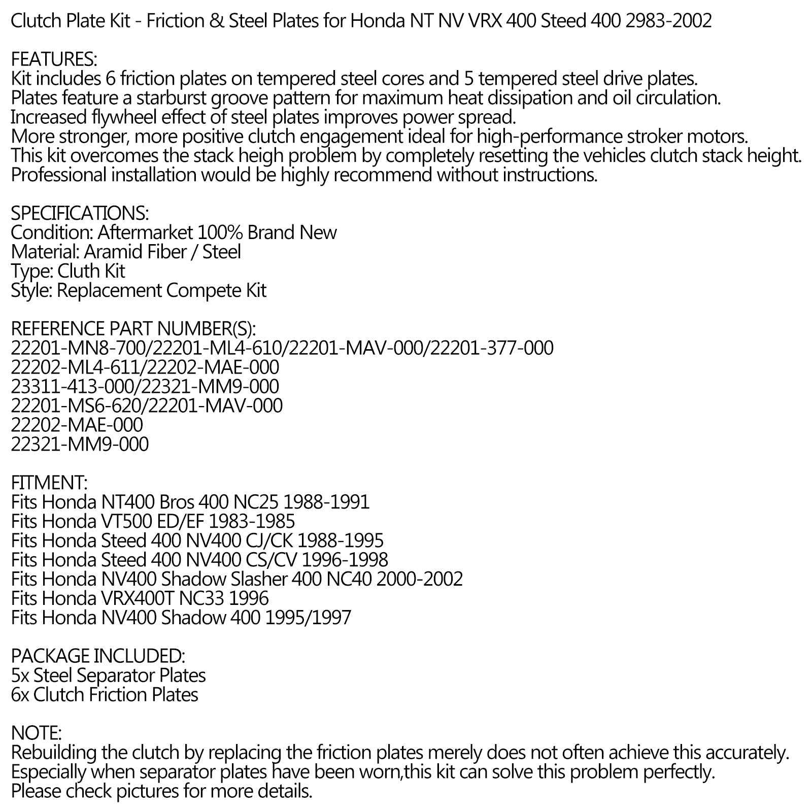 Kit de embrague de acero y placas de fricción para Honda NT NV VRX 400 Steed 400 1983-2002 Genérico