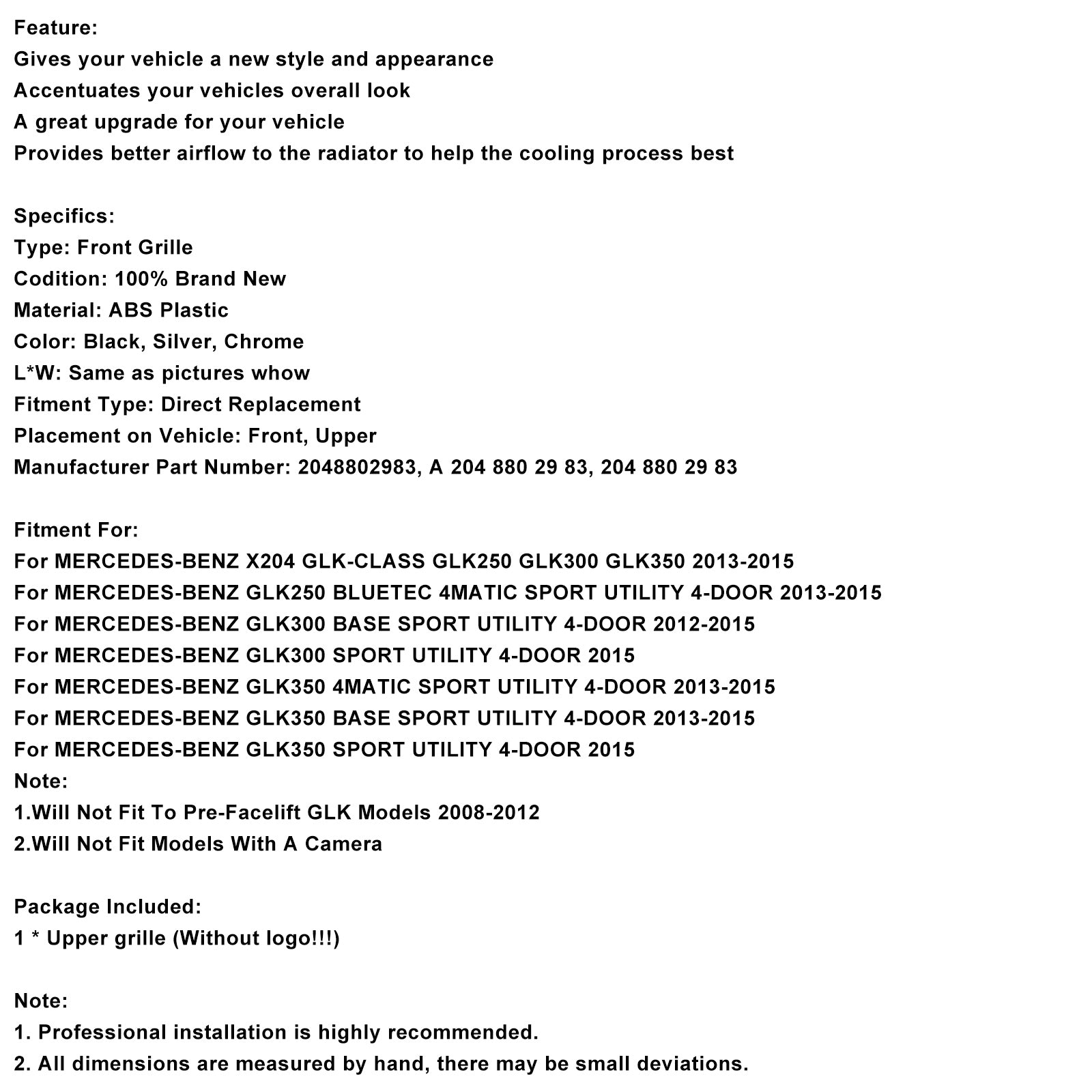 Parrilla de parachoques delantero compatible con Mercedes Benz X204 Clase GLK 2013-2015 Diamond