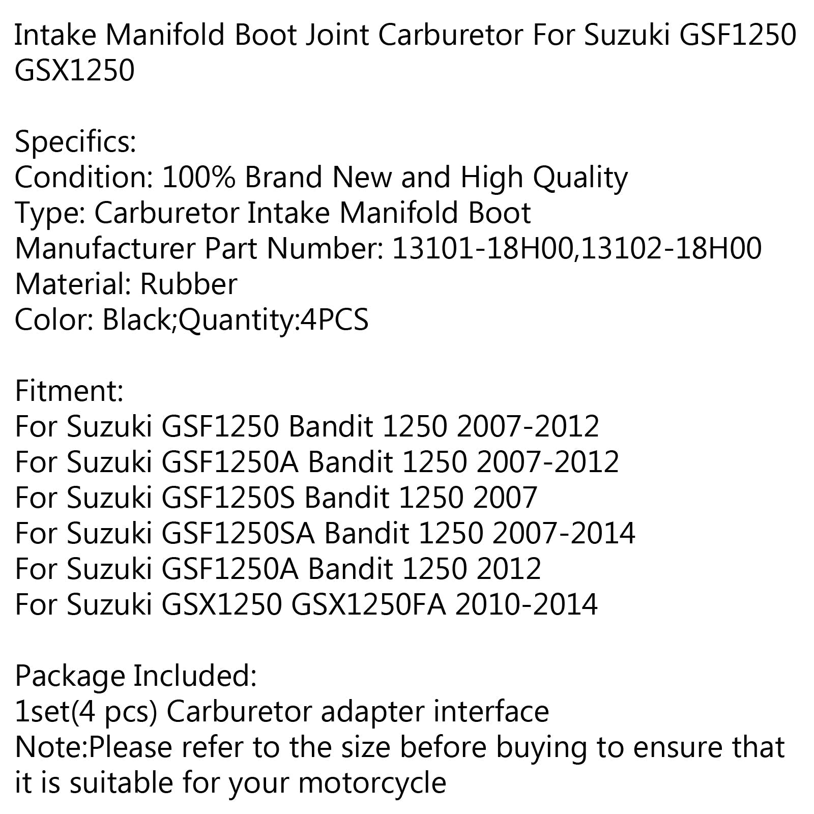 Juego de botas de colector de admisión de carburador para Suzuki GSF1250 Bandit 2007-2012 genérico