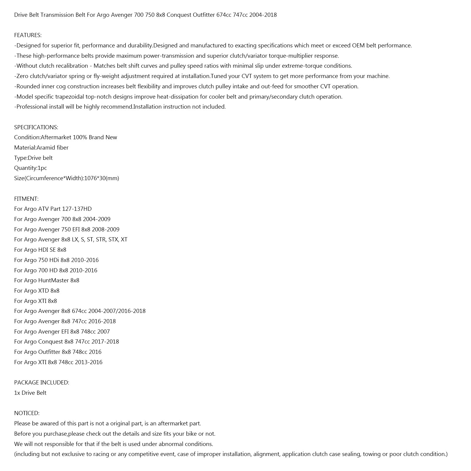 Correa de transmisión 1076OC x 30W para ARGO ATV PART 127-137HD XTI, HDI y AVENGER 8X8 04-18 Genérico