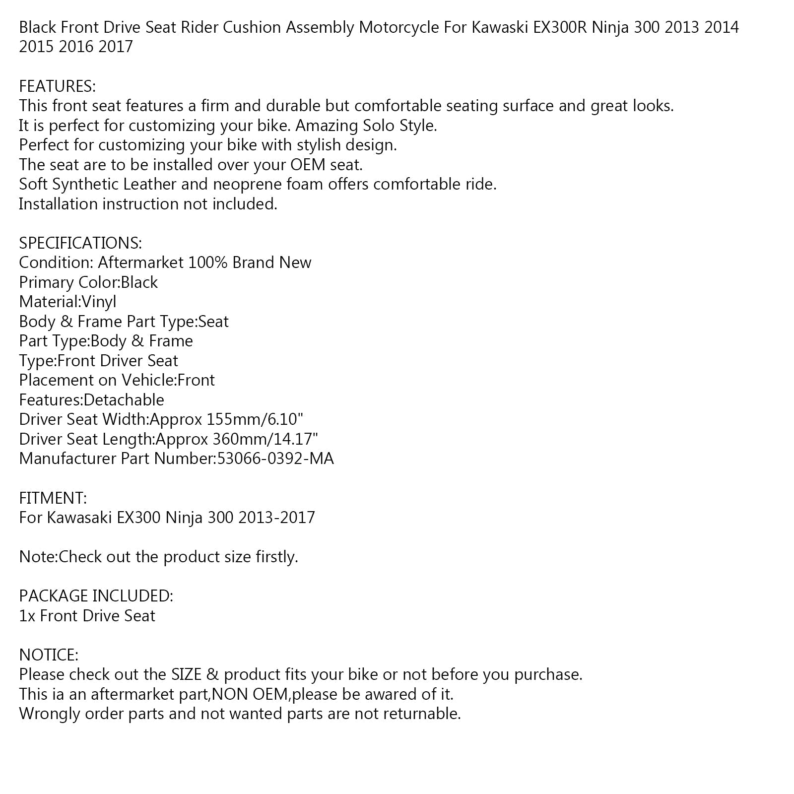 Black Front Driver Seat Rider Cushion Fit For Kawasaki EX300 Ninja 300 13-17 Generic