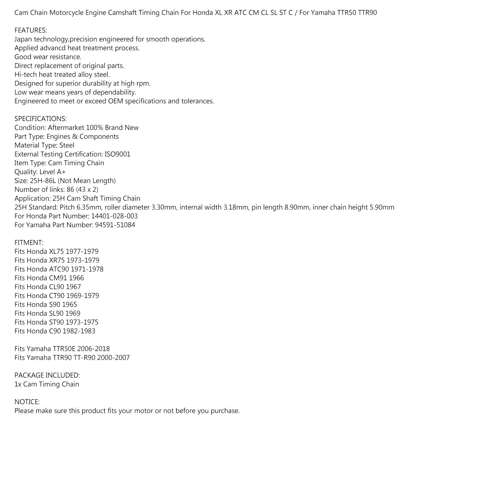 Cadena de distribución de leva 86L para Honda CT9 C ST S CL CM ATC 90 1965-83 #14401-028-003 genérico
