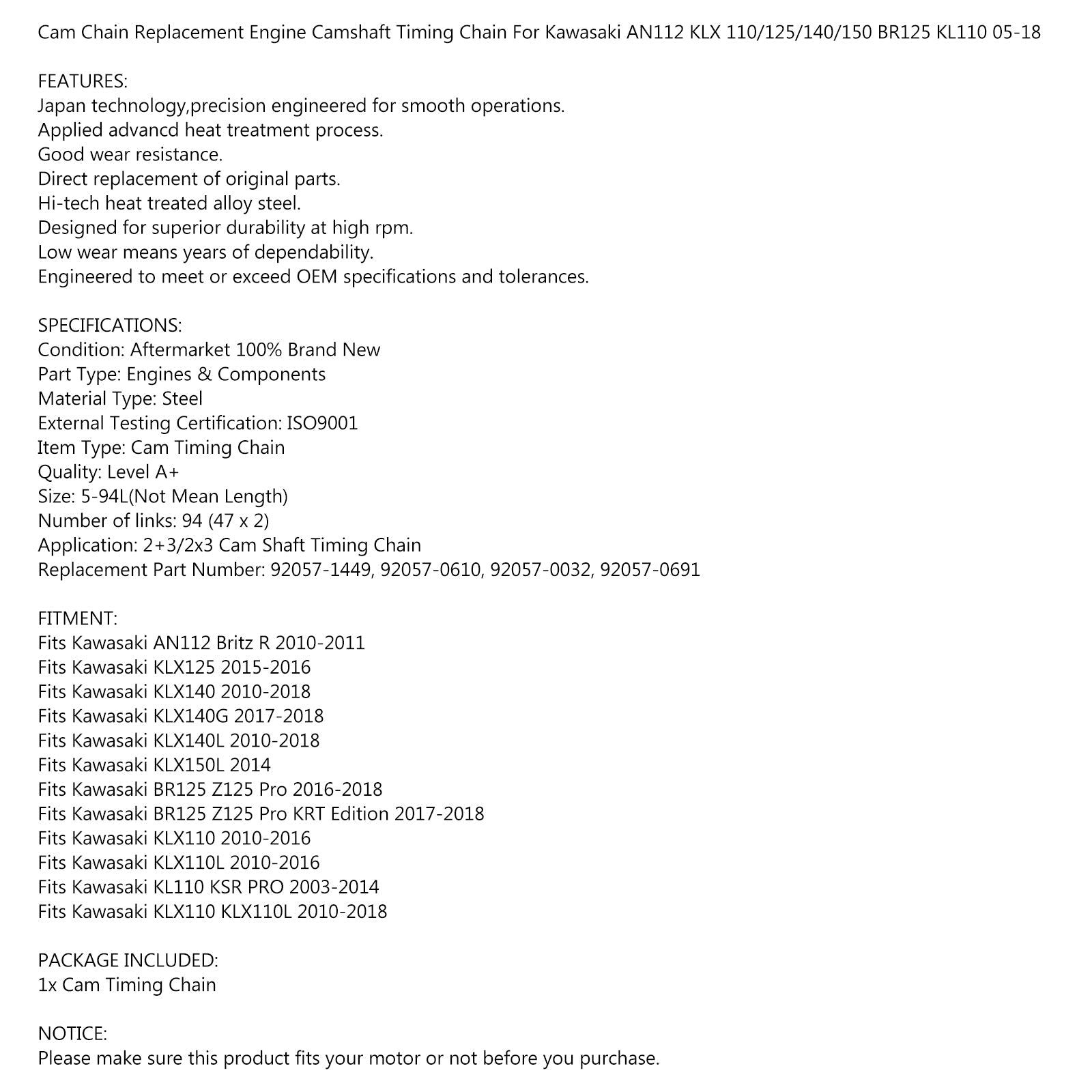 Cadena de levas 94 eslabones para Kawasaki KLX110 KSR PRO 03-18 KLX 125/140/150 BR125 AN112 Genérico