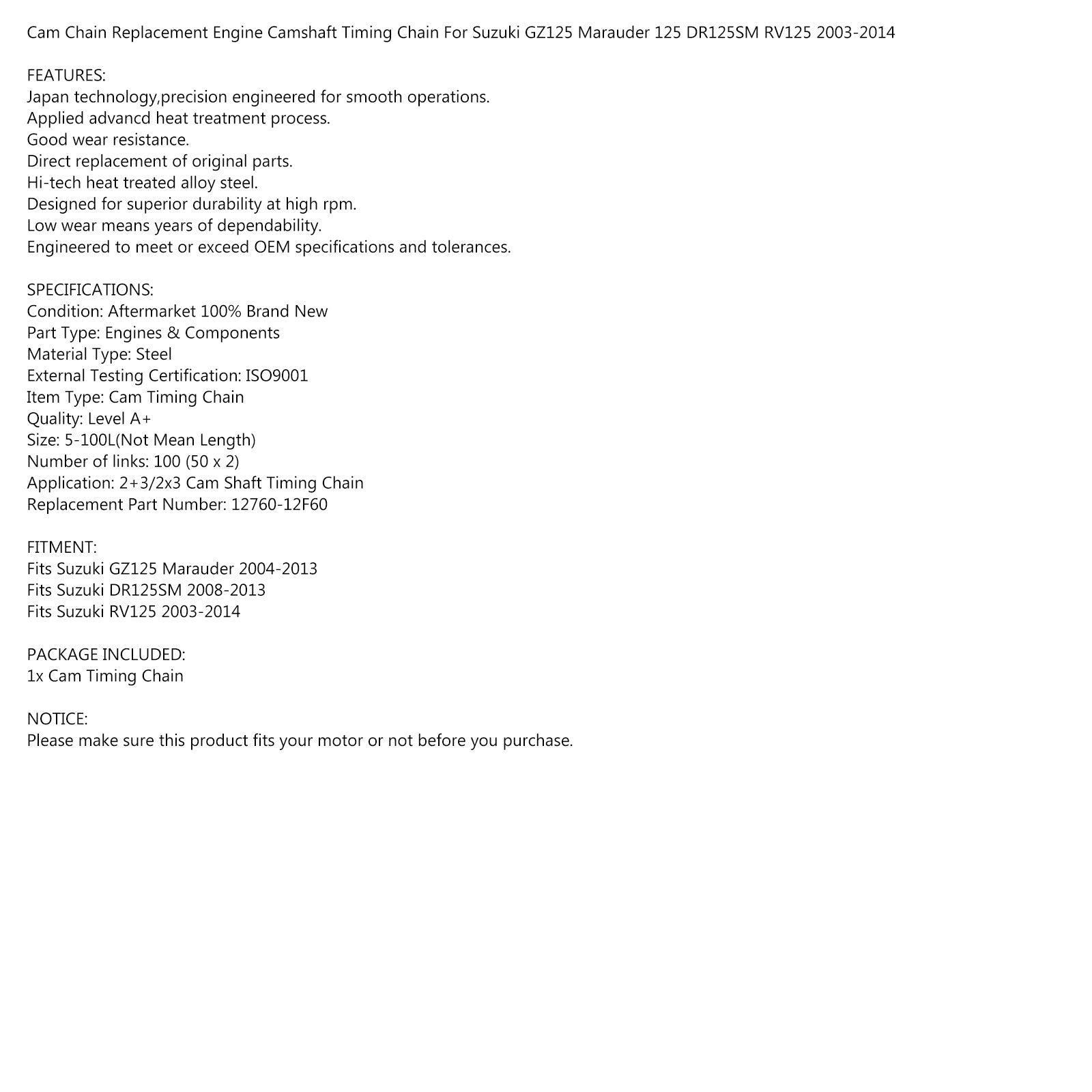 Cadena de levas 100 eslabones para Suzuki GZ125 Marauder / DR125SM RV125 04-13 12760-12F60 genérico
