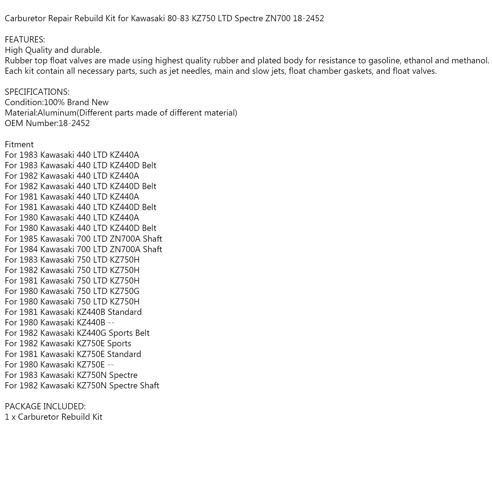 Kit de reconstrucción de reparación de carburador para Kawasaki 80-83 KZ750 LTD Spectre ZN700 18-2452 genérico