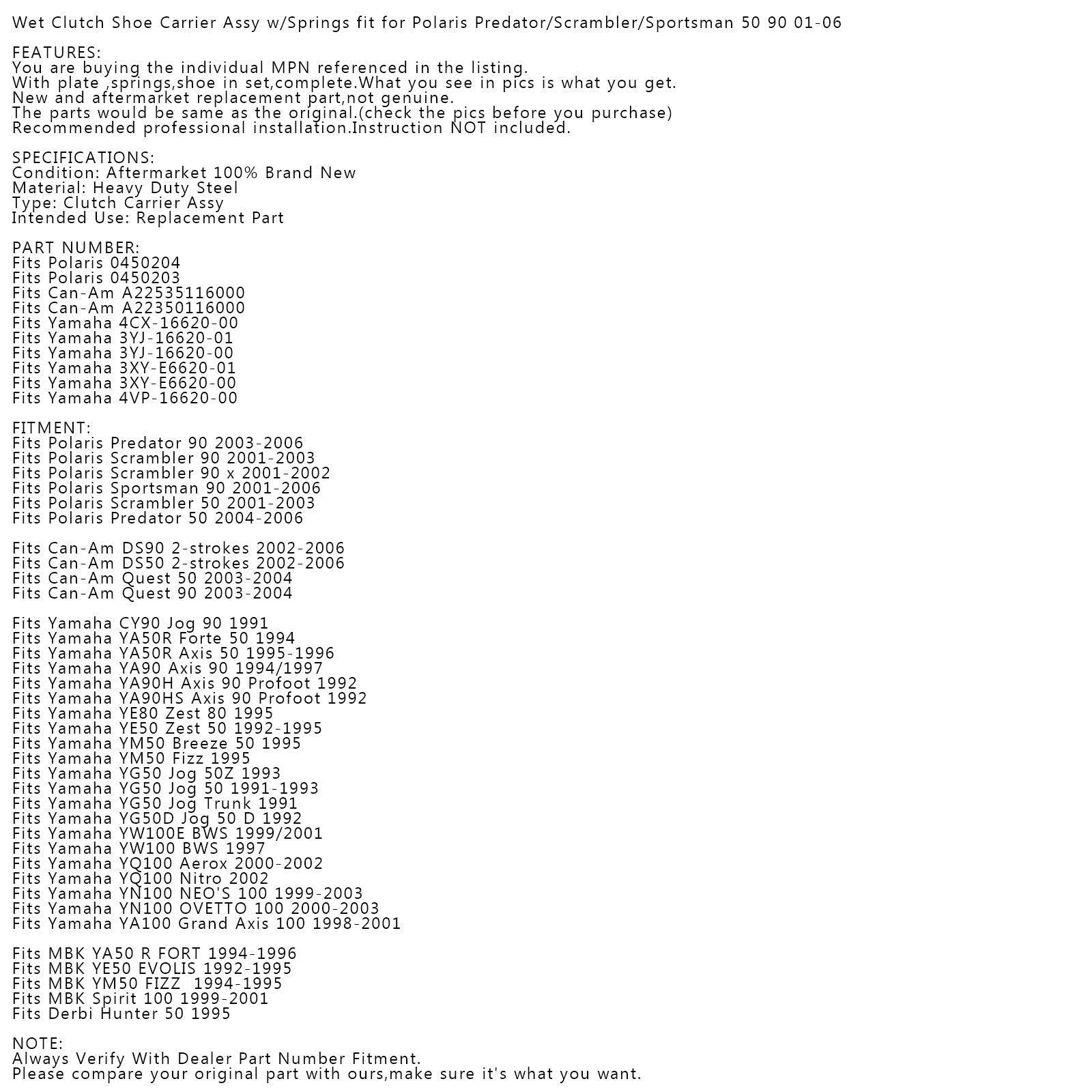 Conjunto de soporte de zapata de embrague húmedo con resortes aptos para Polaris Predator/Scrambler/Sportsman 50 90 01-06