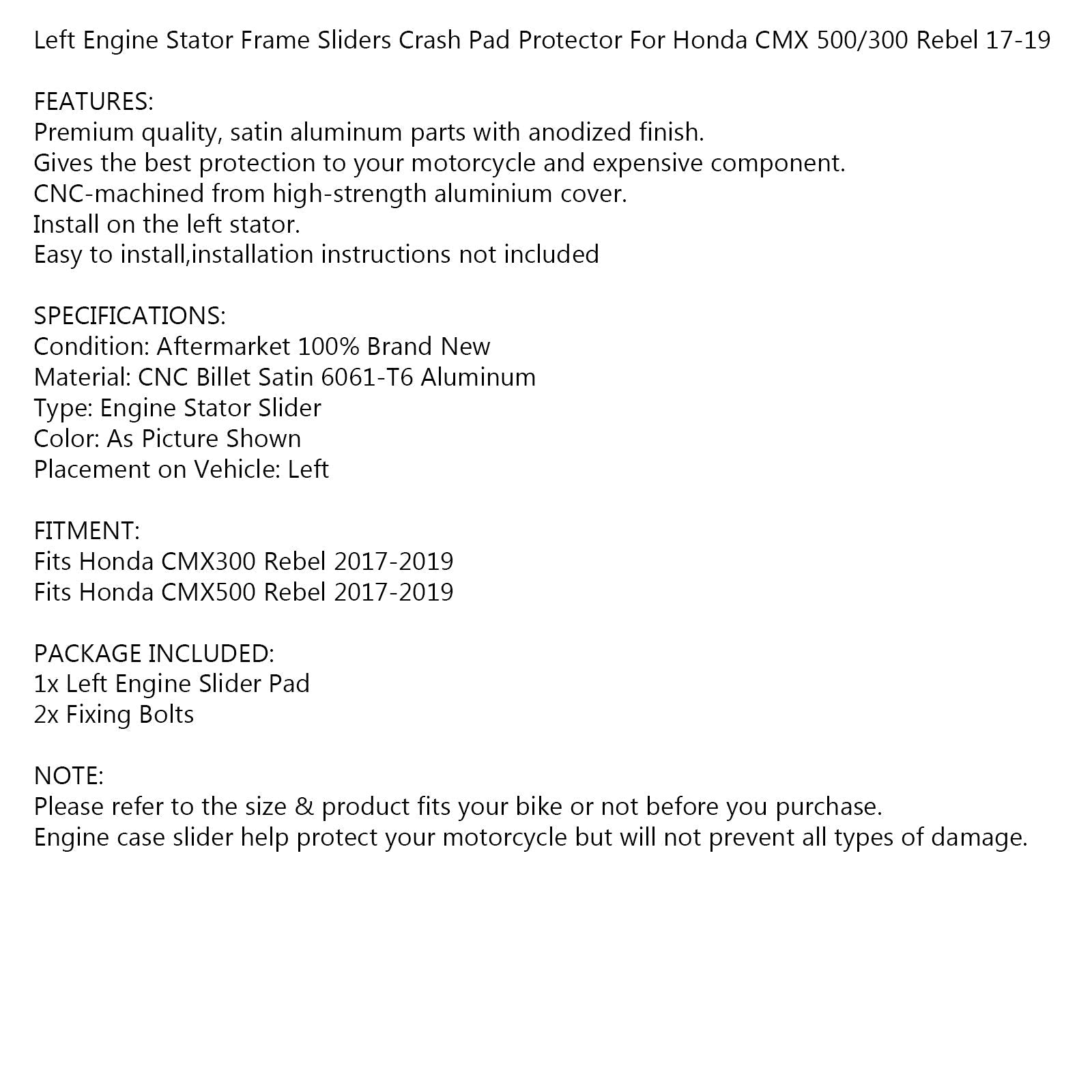 Protector de almohadilla de choque deslizante del marco del estator del motor izquierdo para Honda CMX 500/300 Rebel 17-19