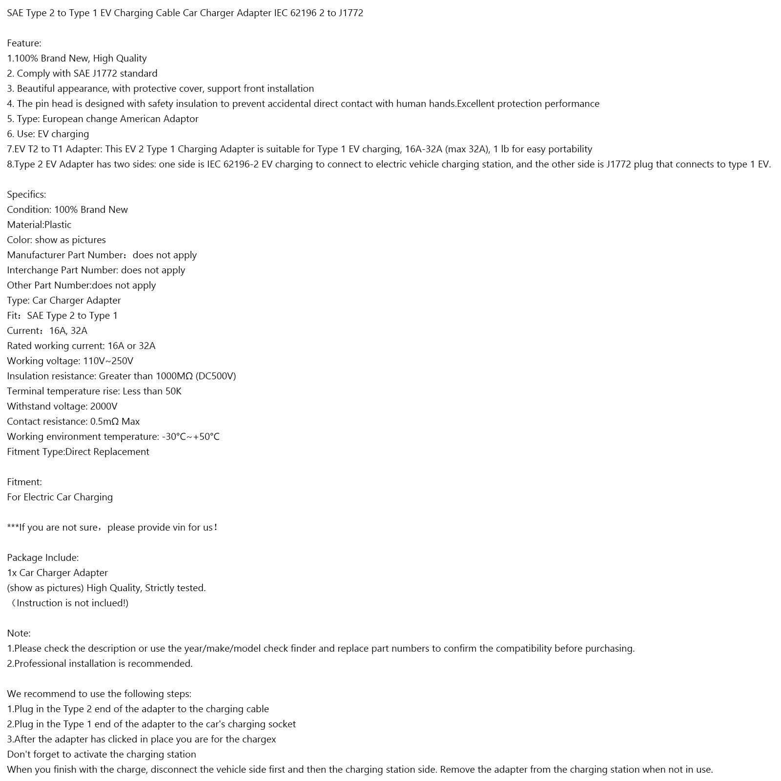 7.EV T2 to T1 Adapter: This EV 2 Type 1 Charging Adapter is suitable for Type 1 EV charging, 16A-32A (max 32A), 1 lb for easy portability